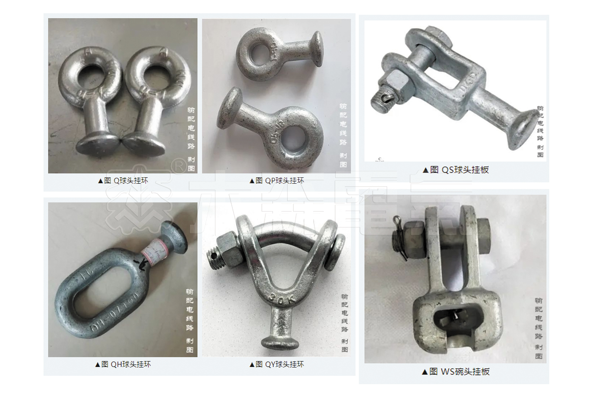 (3)连接金具:将绝缘子、悬垂线夹、耐张线夹及防护金具等连接组合成悬垂或耐张串(组)的金具称为连接金具。根据其使用条件和结构特点,连接金具可分为球-窝系列连接金具、环-链系列连接金具、板-板系列连接金具。球-窝系列连接金具是专用金具,是根据与绝缘子连接的结构特点设计出来的,用于直接与绝缘子相连接。球-窝系列连接金具包括球头挂环(q型、qp型、qy型、qh型球头挂环、qs型球头挂板)和碗头挂板(w型、ws型、wg型、wsy型)等。环-链系列连接金具是通用金具,它采用环与环相连的结构,属于线-线接触金具。它结构简单,受力条件好,转动灵活,不受方向的限制,转动角度比球窝型大得多。环-链系列连接金具包括u型挂环、直角环、延长环、u型螺丝及延长拉杆等。板一板系列连接金具包括平行挂板、pd挂板、直角挂板、u形挂板、联板、牵引板、调整板、十字挂板、联板支撑等。板一板系列连接金具多数采用中厚钢板以冲压、剪割工艺制成,一般情况下不宜采用铸造加工工艺。板-板系列连接金具也是通用金具,它的连接必须借助于螺栓或销钉才能实现。它结构简单。对盘形悬式绝缘子使用的板-板系列连接金具是双腿槽型与单腿扁脚的结构。对槽型绝缘子使用的板-板系列连接金具的扁脚中心至底边尺寸不应大于22mm。