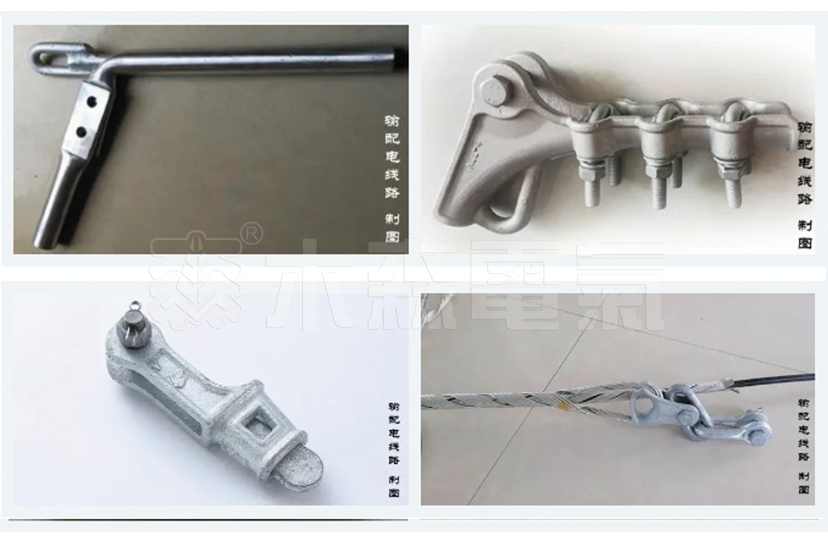 (6)拉线金具:拉线金具主要用于电力线路转角、终端杆塔等的固定,包括紧线、 调整和连接等金具。可调式ut型线夹,利用该线夹可调节拉线的松紧;楔型线夹的楔子可以与线夹本体固定拉线。