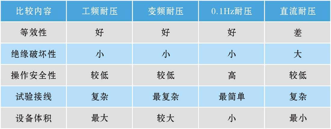 根据我国电力系统实际情况,国家发改委已制定了《35kv 及以下交联聚乙烯绝缘电力电缆超低频(0.1hz)耐压试验方法》行业标准,2004 年颁布了电力行业标准《超低频高压发生器通用技术条件 dl/t 849.4-2004》,我国正在推广这一最新的试验方法。虽然直流耐压试验设备具有体积小、重量轻和造价低等优点,但是直流耐压试验对被试品绝缘破坏性也是最大的。(见表 2)所以国家最新颁布的电气设备预防性试验相关规程已经明文规定不再使用直流高压对电气设备进行耐压试验,推荐使用交流耐压试验。